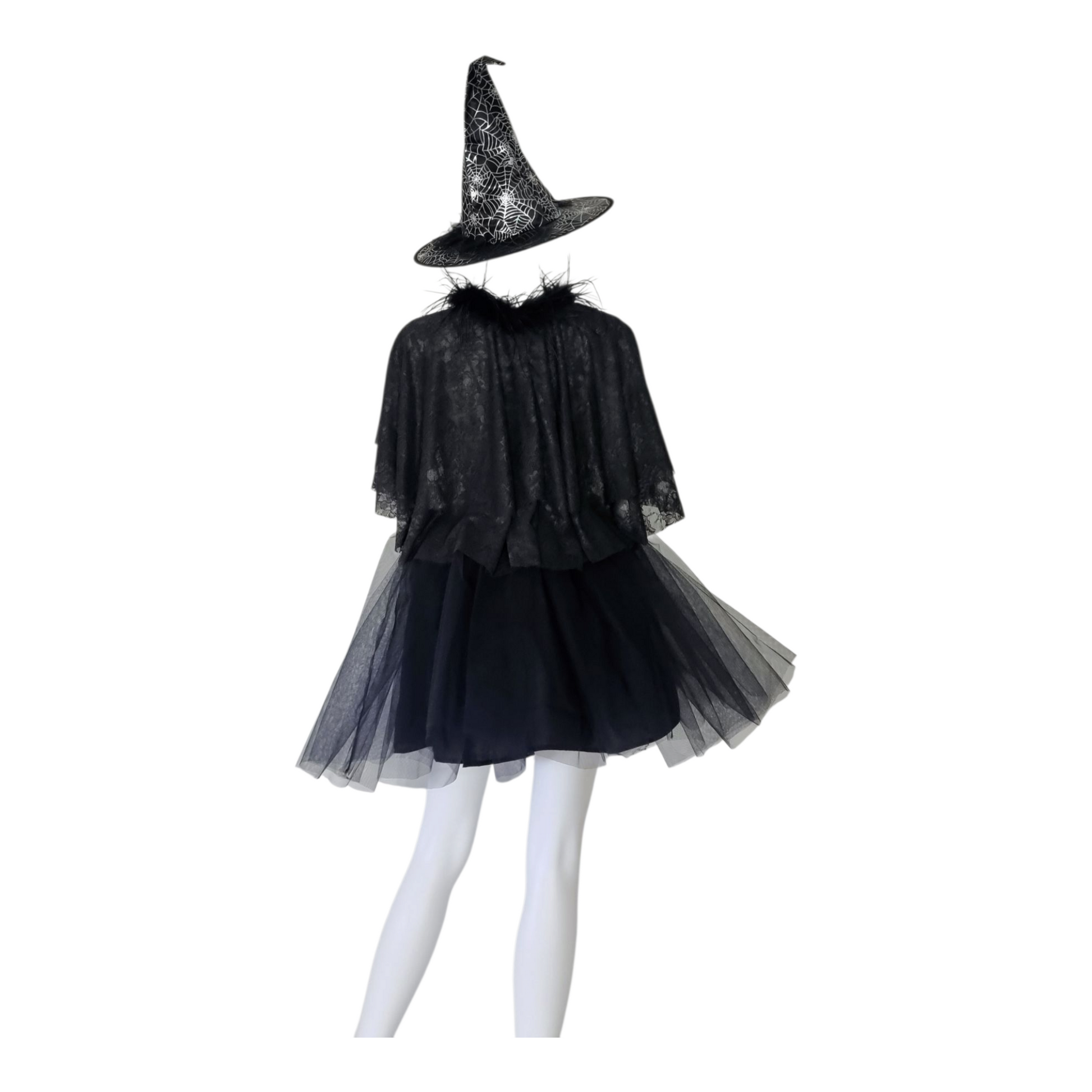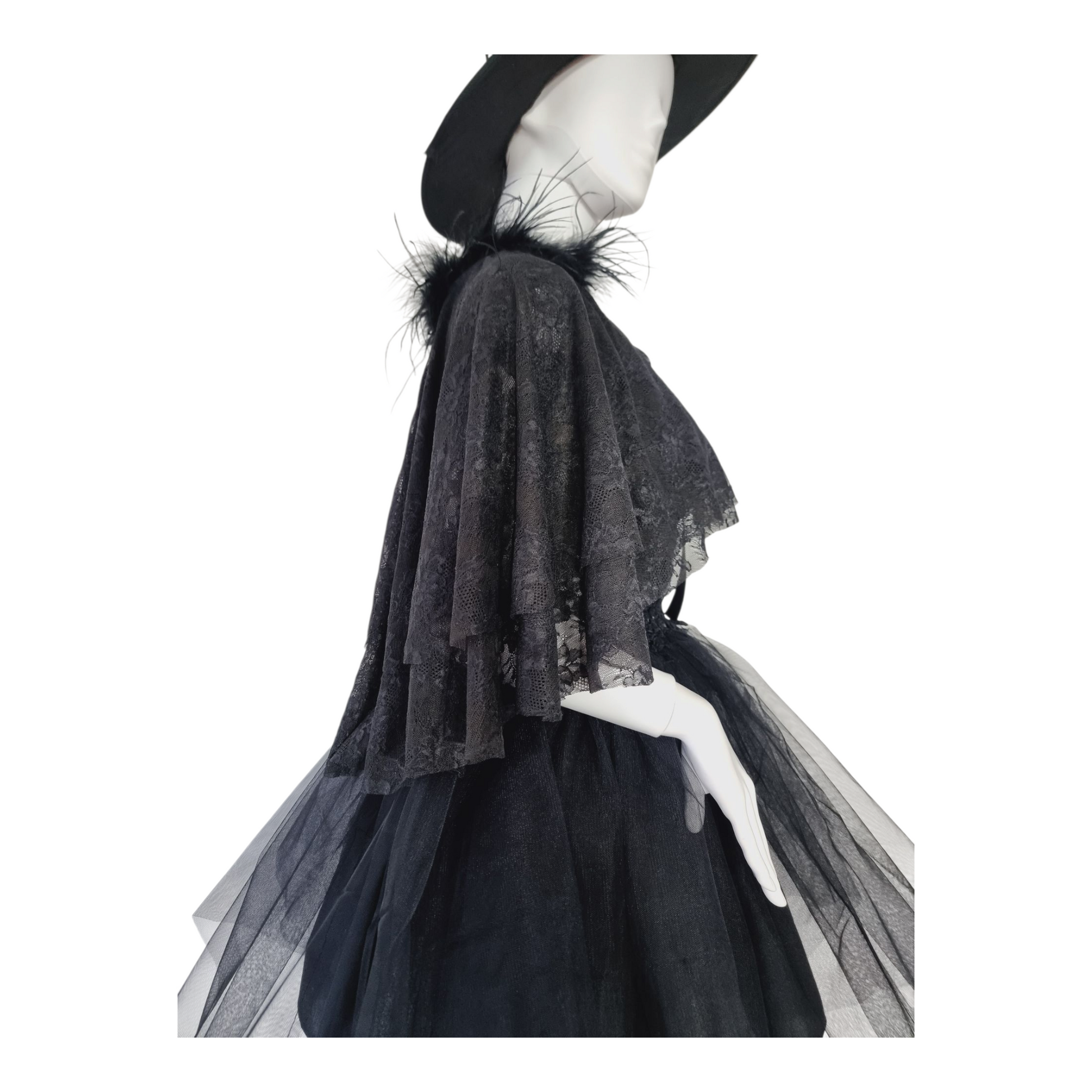 Handmade 4-piece Halloween witch costume with lace top, tulle skirt, feather-trimmed cape & hat. Comfortable, spooky, and photo-ready