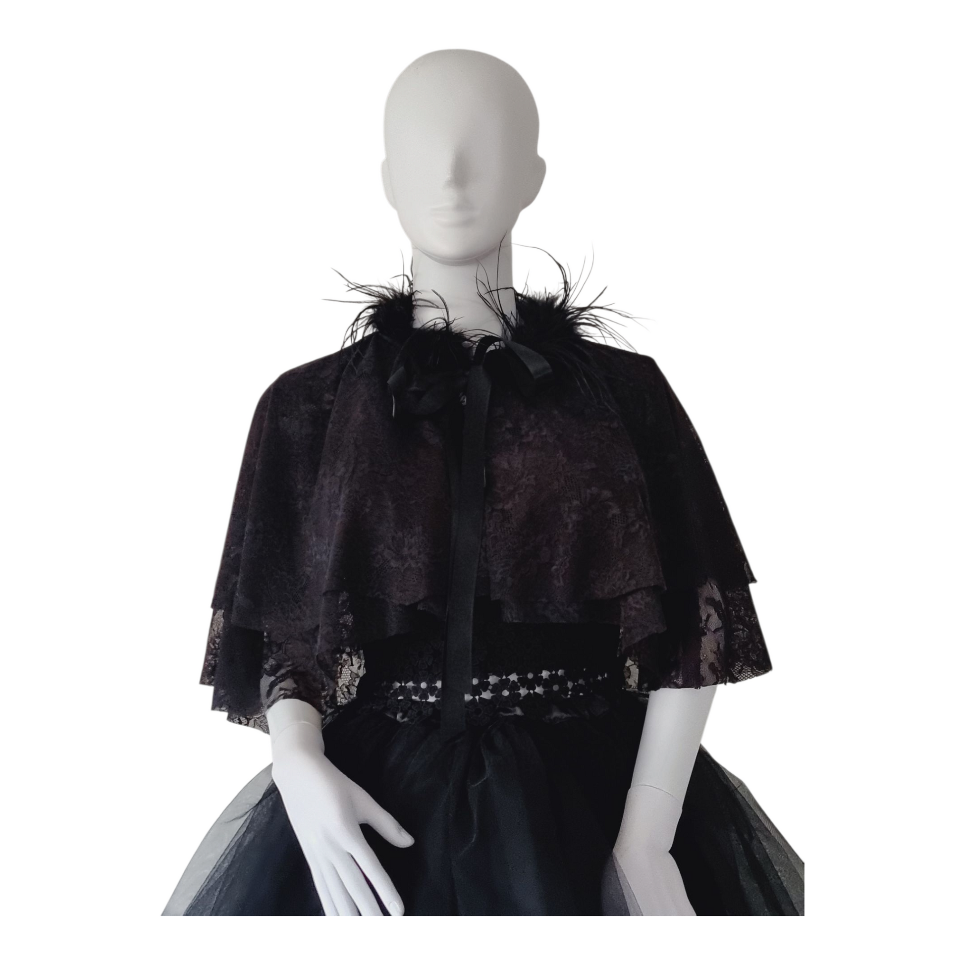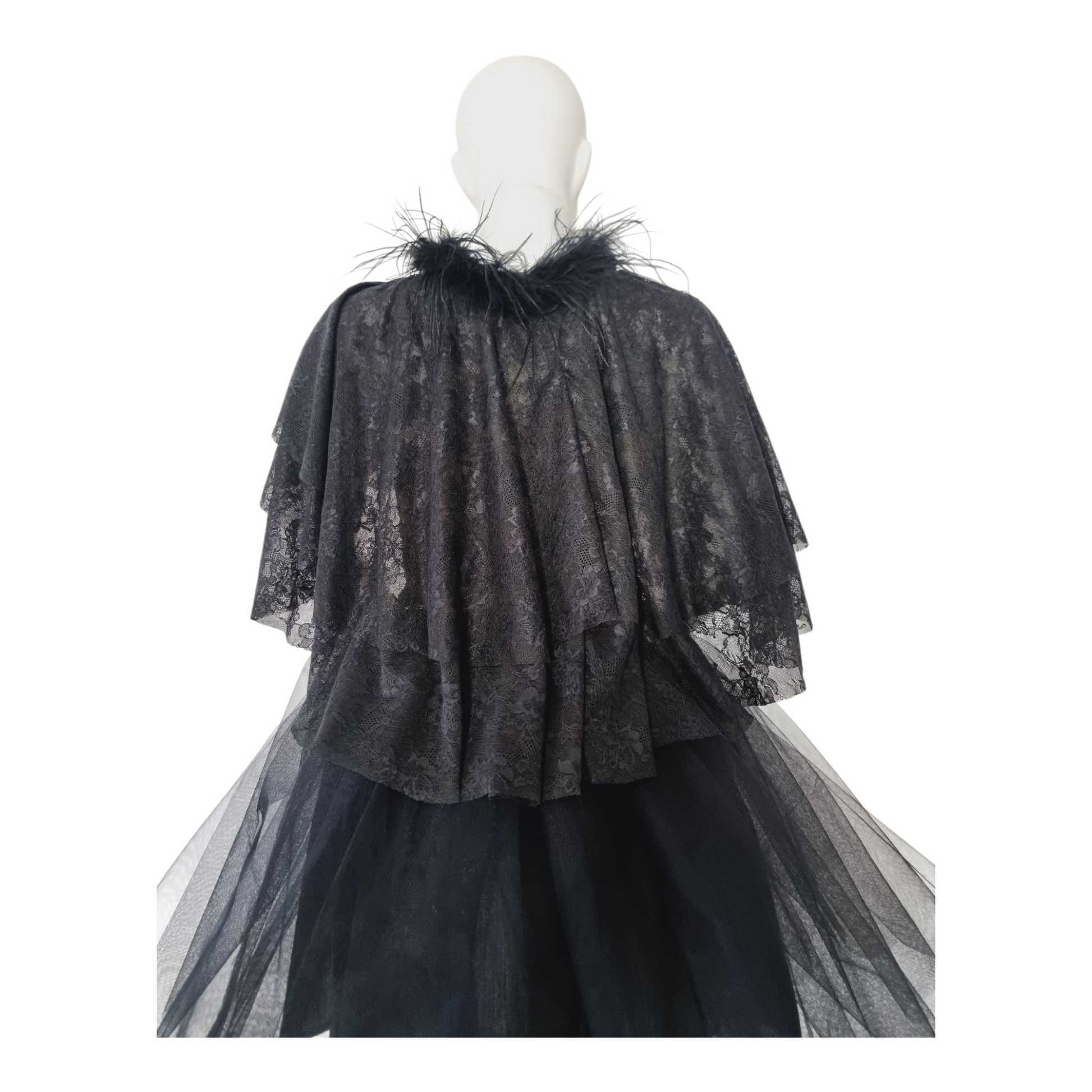 - Cape – Made from delicate lace, finished with luxurious ostrich feather lace trim for added drama.