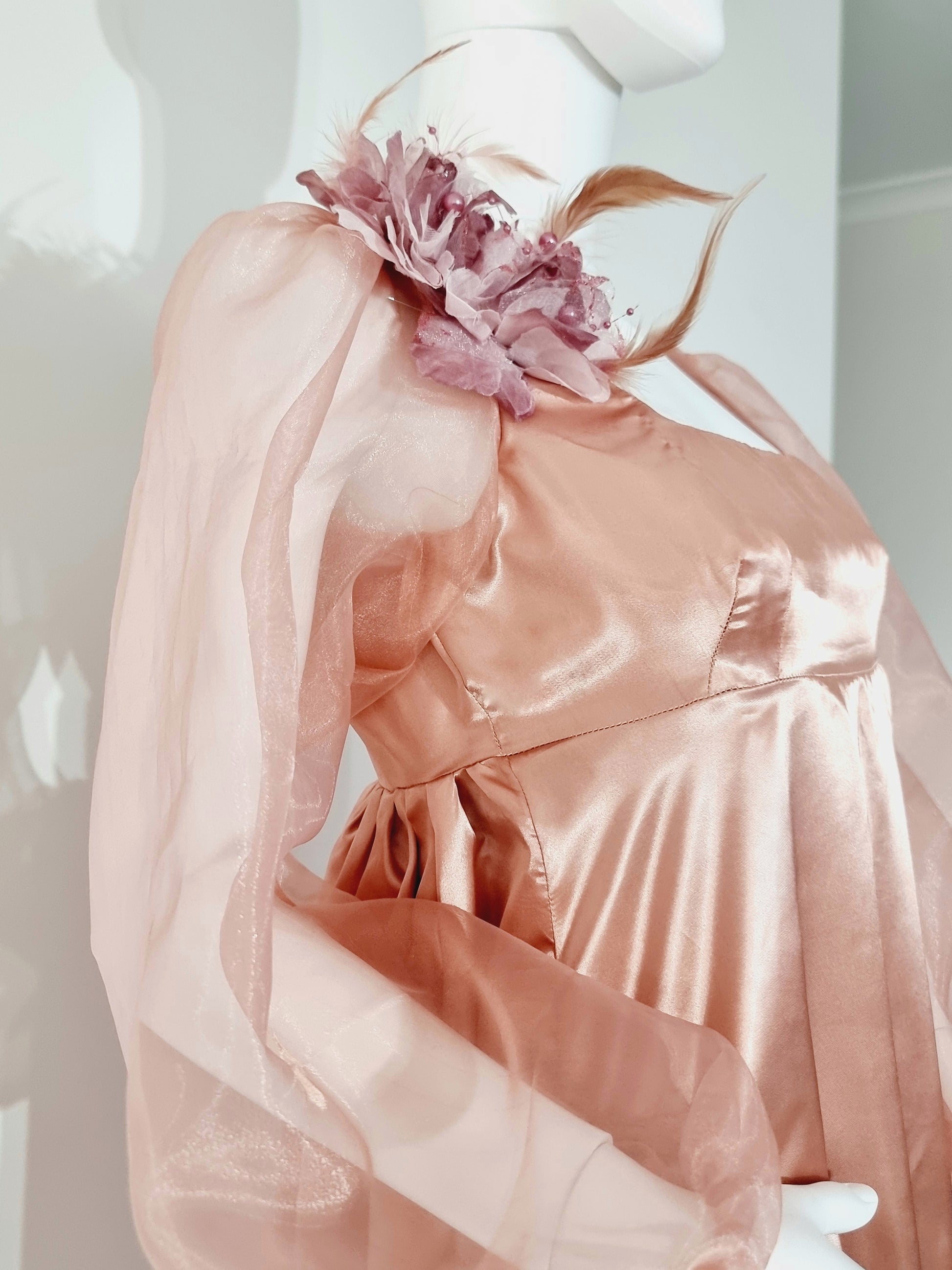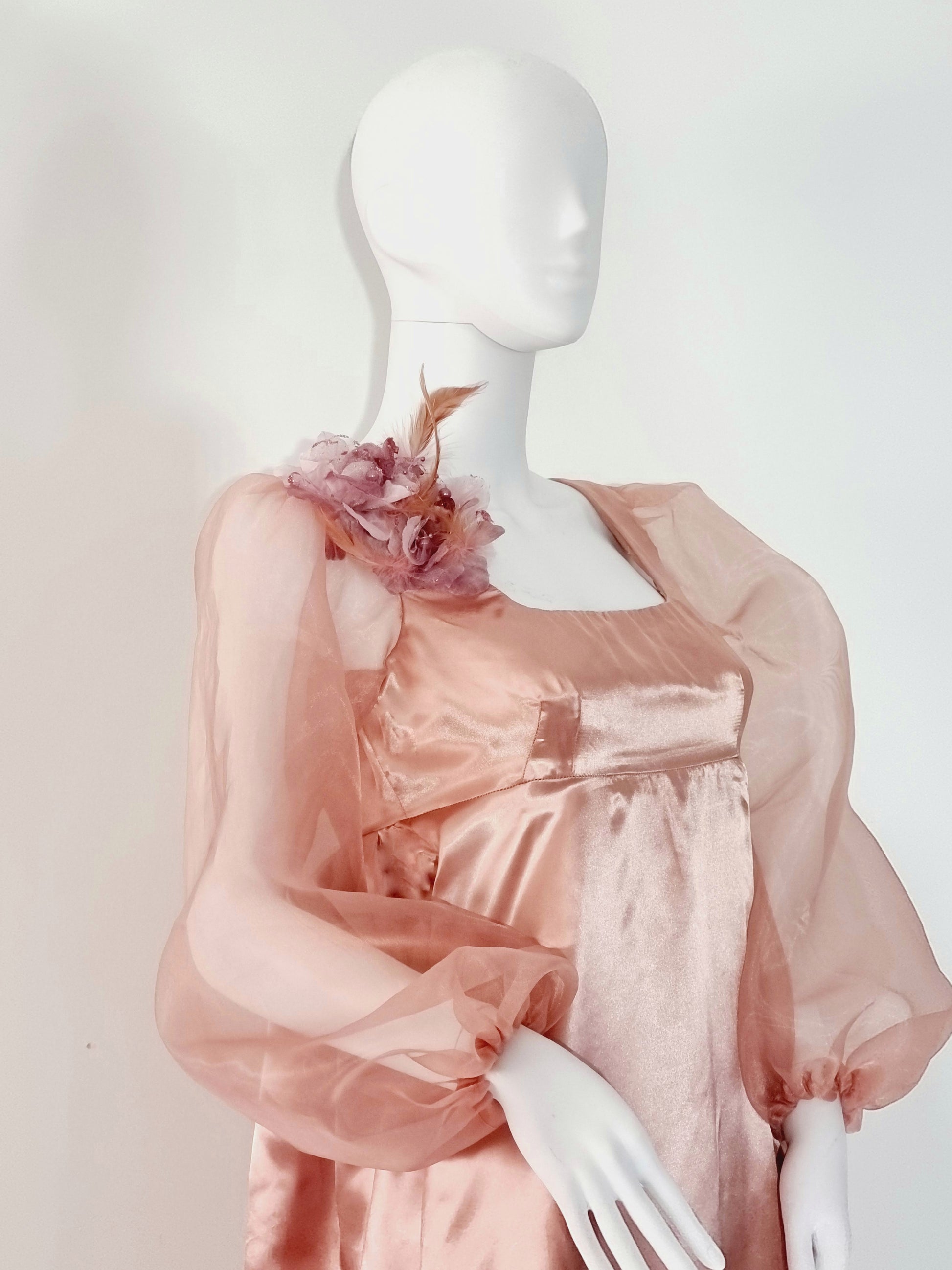 This elegant apricot color regency hand made dress is made with satin and organza fabric and dress is fully lined. Sleeves are made with Organza fabric. This Dress has empire waist, square neck and back of the dress beautifully gathered. These dress are perfect for a regency ball, photography studio, stage dramas, bride maids,birthday, wedding,party and other special occasions.